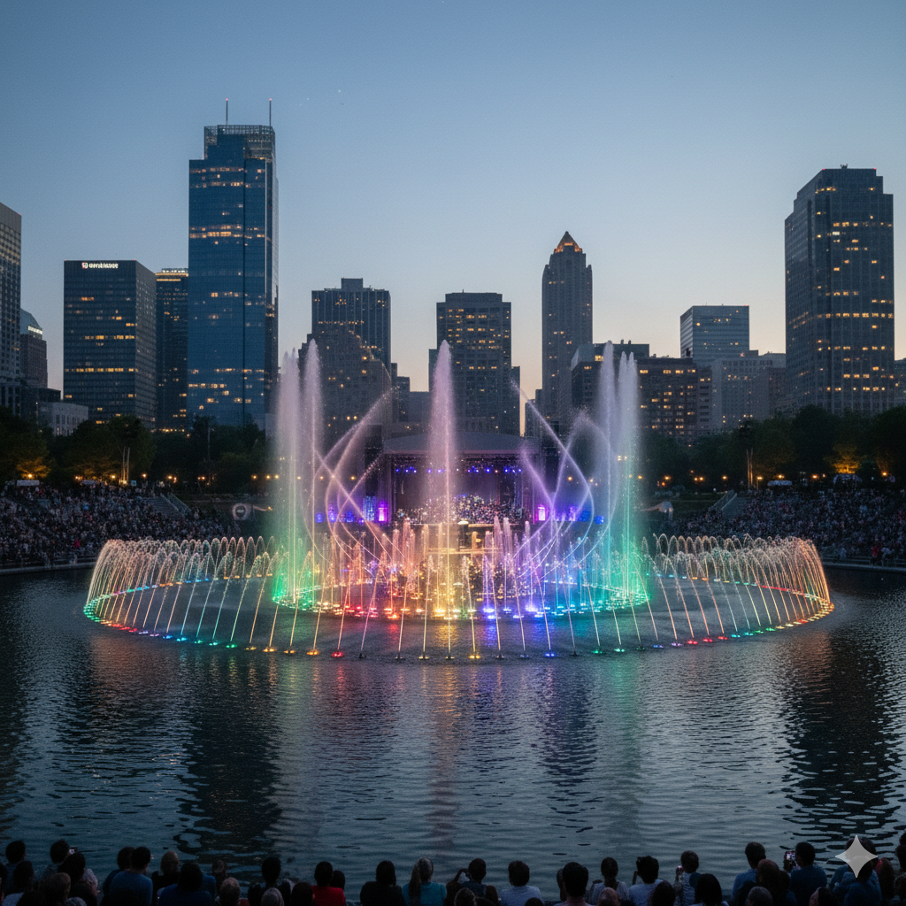 • Visual Spectacle: These fountains are made to provide the most striking possible appearance. To produce a variety of water patterns, they employ a broad range of nozzle types, ranging from dynamic “peacock tails,” shimmering mists, and revolving spirals to tall vertical blasts and graceful parabolic arches.