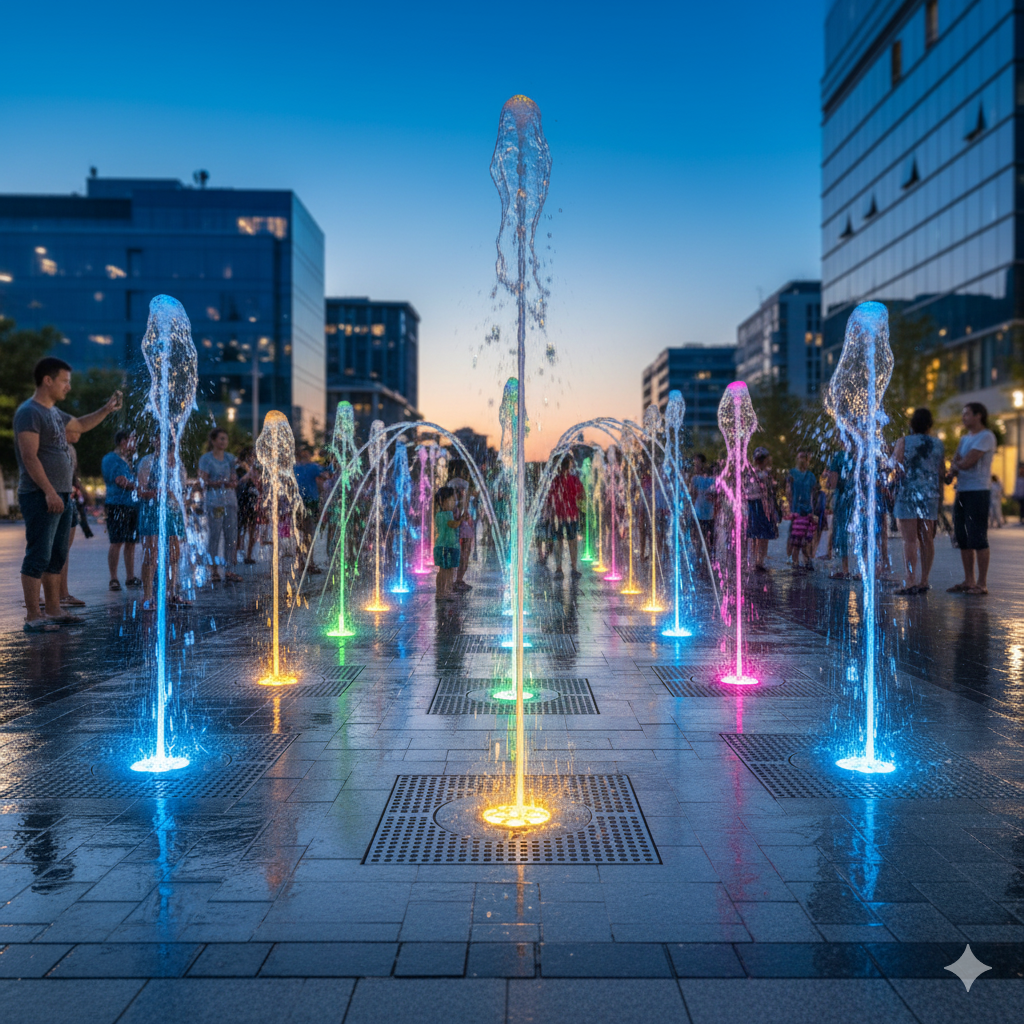 Dynamic and Surprising: A sense of surprise and delight is created by the water jets’ abrupt appearance and departure from the apparently solid ground. With water motions timed to music and vibrant lights, the staged performances are every bit as engaging as classic musical fountains.