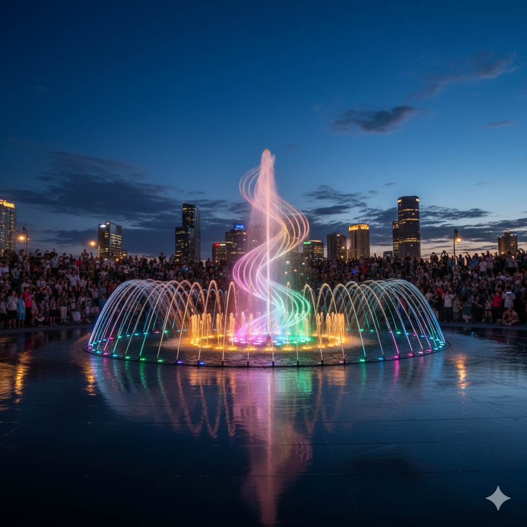 The ultimate in planned water entertainment is a Dynamic Musical Fountain. This sophisticated system uses variable-speed pumps and precisely controlled parts to provide a constantly shifting and incredibly expressive presentation, going beyond basic on/off water jets. The term “dynamic” describes the variety of water movements that are synced in real-time with music, ranging from soft pulsing and swaying to strong blasts and complex, dancing patterns. With each display, this kind of fountain provides a fresh and enthralling spectacle. It is intended to be the focal point of public squares, parks, resorts, and performance spaces.